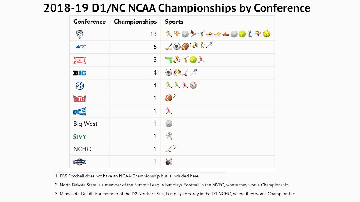 Great find, Z! 1. The Pac-12 are the masters of sports nobody else cares about. 2. The ACC won the only 2 that matter. 3. Big XII: I don't know what half that stuff is! 4. The Big Ten better be glad they got Maryland. 5. The SEC better be glad they've got Vanderbilt.