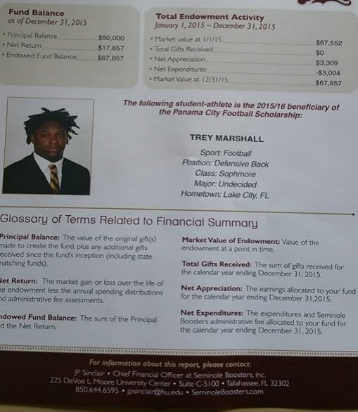 This is a $50,000 scholarship from the Panama City Seminole Club for a football scholarship. This year their scholarship was given to Trey Marshall. As you can see the scholarship made $3,309 in interest this year and has made $17,857 in the little over 5 years since they endowed this scholarship. The total value of this scholarship is 67,857 over the life. Of course it takes more than one $50,000 scholarship to fund Mr. Marshall's education, housing, meals, etc so there are probably other donors with Mr. Marshall as the student athlete their scholarship supports. Boosters tries to give you a student athlete close to your location (Bay County will have Janarious Robinson this coming fall, the 1st player since Bert Reed)