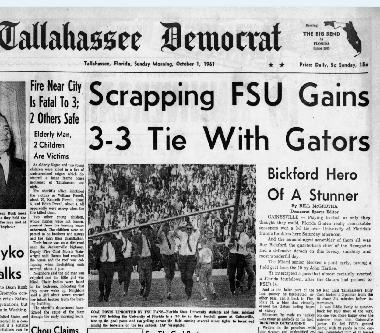 I remember it well. It was the first FSU game I attended and I watched the brawl at the end. Lot of teeth and blood. Security couldn't get it to stop, so the Marching Chiefs played "Dixie" (Back in '61, everyone stopped what they were doing when Dixie was played. Did stop anyone. They finally turned on the sprinklers and the fighting stopped.